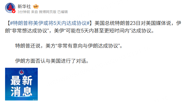 新华社报道,美国总统特朗普23日对美国媒体说,伊朗“非常想达成协议”,美伊“可能在5天内甚至更短时间内”达成协议。