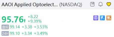 光通信牛股Applied Optoelectronics涨超9%,公司在盘后宣布获得价值5300万美元的800G模组订单后进一步涨超3%。