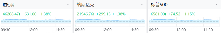 截至收盘,标普500指数涨1.15%,报6581点;纳斯达克综合指数涨1.38%,报21946.76点;道琼斯工业平均指数涨1.38%,报46208.47点。