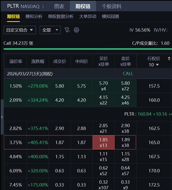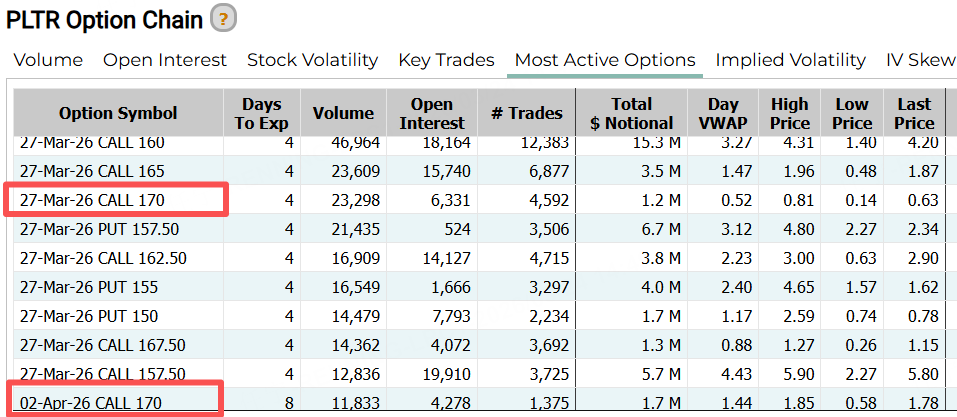 期权方面,Palantir的认购合约在昨日成交前十中占据七席。其中有两张CALL均押注170美元,到期日分别为3月27日及4月2日。