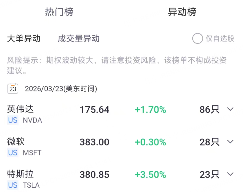 特斯拉、英伟达、苹果、微软、亚马逊、超微电脑、美光科技、Meta、SoFi、AMD位居个股期权成交榜的前十位。其中,英伟达的异动大单达到86只。