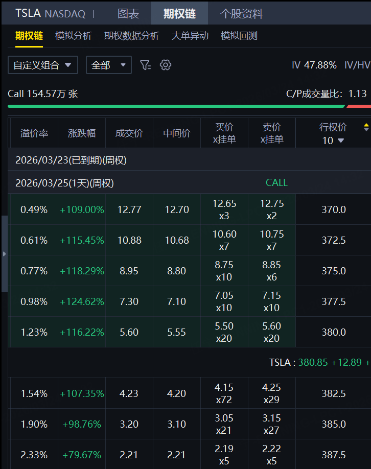 特斯拉3月25日到期的认购合约集体大涨,多张合约涨幅超100%,行权价最高超390美元。