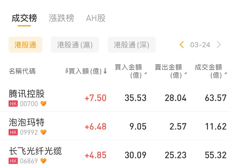 腾讯控股、泡泡玛特、长飞光纤光缆分别获净买入7.5亿港元、6.48亿港元、4.85亿港元;