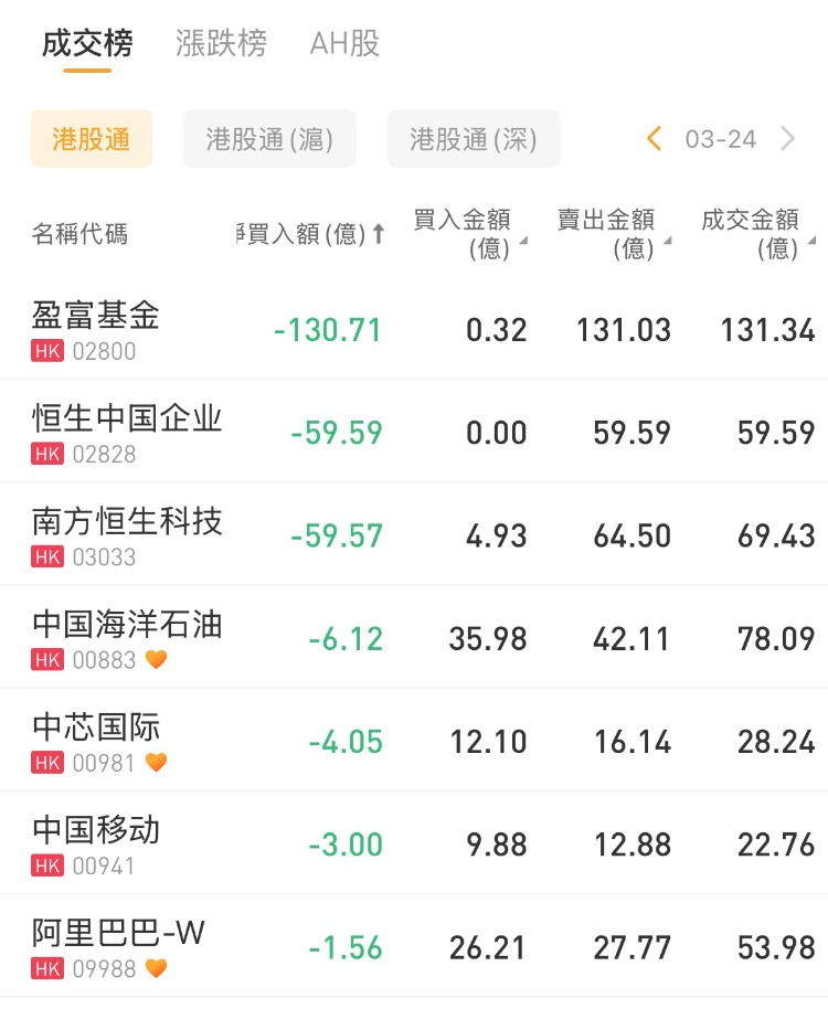盈富基金、恒生中国企业、南方恒生科技分别遭净卖出130.71亿港元、59.59亿港元、59.57亿港元。