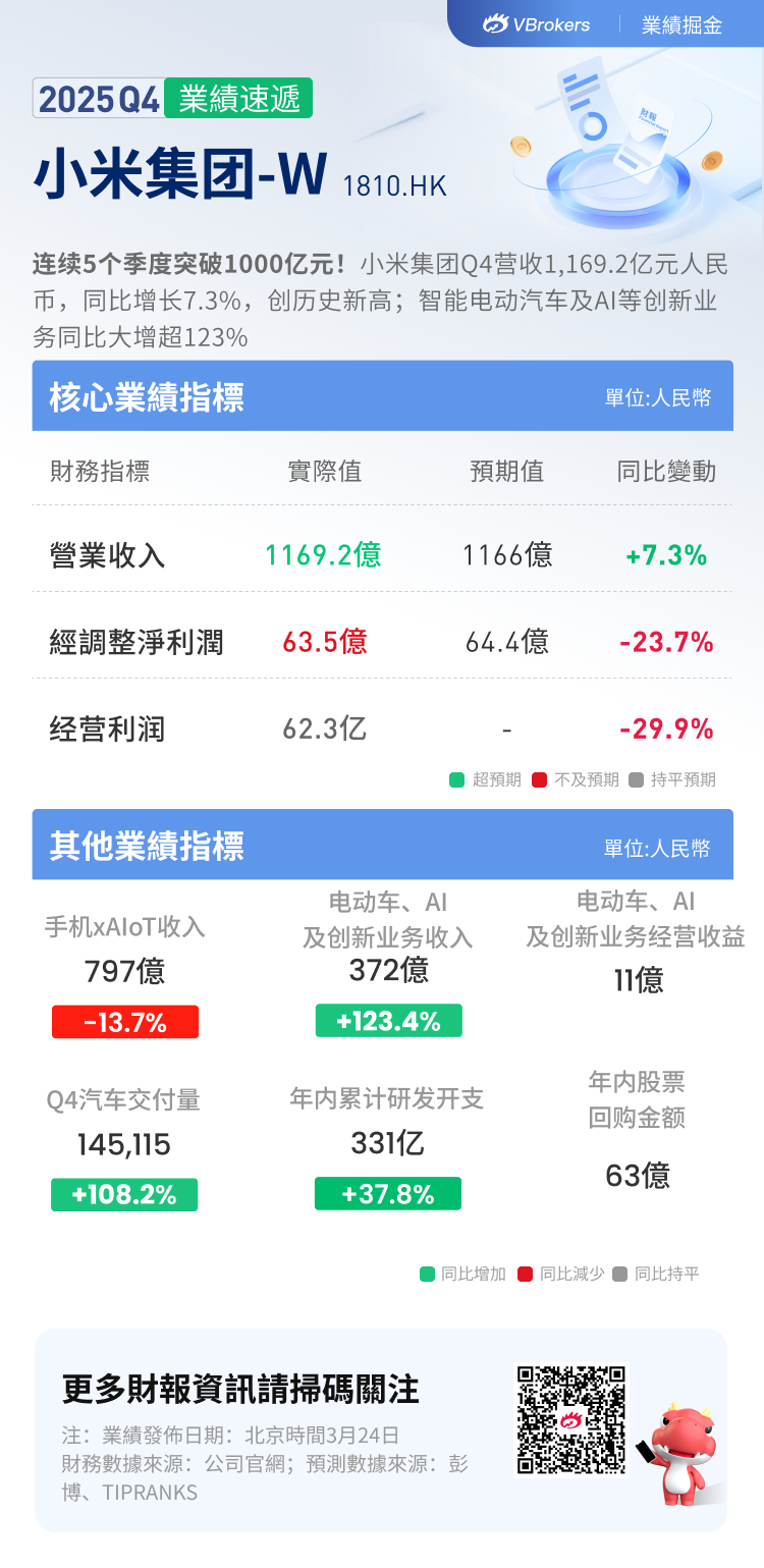 华盛资讯3月24日消息,小米集团-W公布截至2025年12月31日止的四季度业绩。