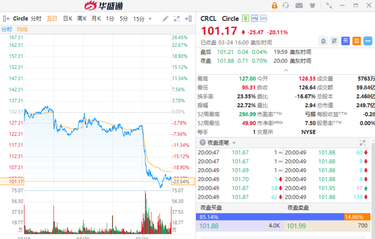 中东战局消息反复!美股三大指数隔夜收跌,道指跌0.18%,标普500指数跌0.37%,纳指收跌0.84%;大型科技股普跌,谷歌跌近4%,微软跌近3%;稳定币概念股Circle暴跌逾20%。