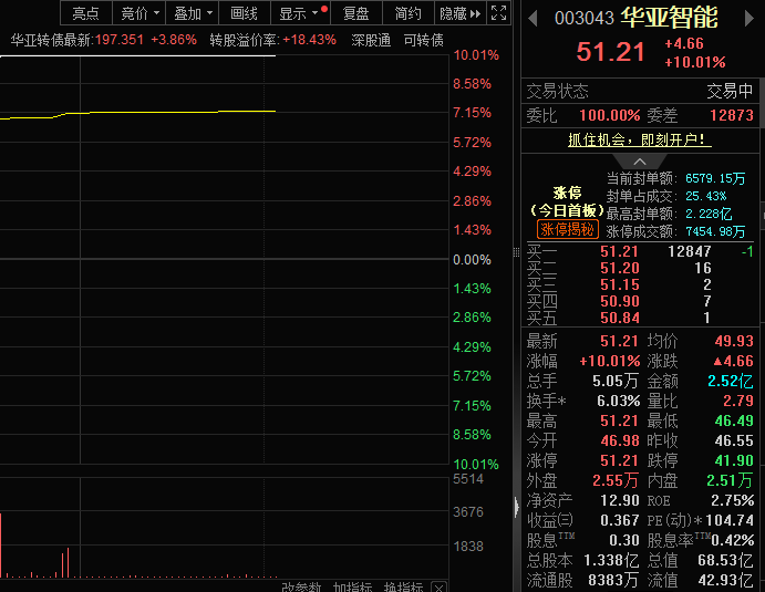 3月25日,华亚智能(003043)股价实现涨停。截至发稿,封单金额超6000万。