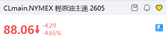 周三国际油价大幅下跌, WTI原油主连 2605 跌逾4%,布伦特原油跌逾5%。