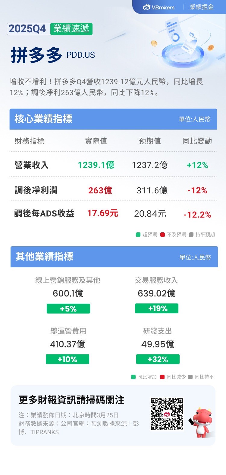 华盛资讯3月25日消息,拼多多公布截至2025年12月31日止的四季度业绩。 拼多多绩后美股盘前一度跌近3%。