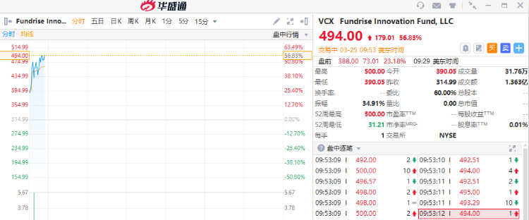 截至发稿,上周四登陆美国纽约证券交易所的Fundrise创新基金(VCX)周二继续冲高超30%,最新报价达262美元,较IPO价格31.25美元翻了8倍有余。