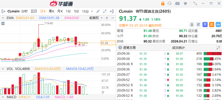 周四早盘WTI升破每桶91美元,此前周三收跌约2%,布伦特收于每桶102美元上方。美国和伊朗就结束战争的努力发表了相互矛盾的表态。这场冲突导致霍尔木兹海峡陷入瘫痪并引发全球能源危机担忧。