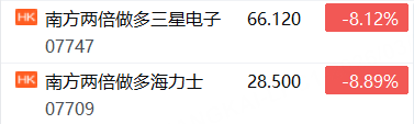 3月26日,港股存储概念走低,南方两倍做多海力士、南方两倍做多三星电子跌超8%,兆易创新跌超4%,澜起科技跌近2%。