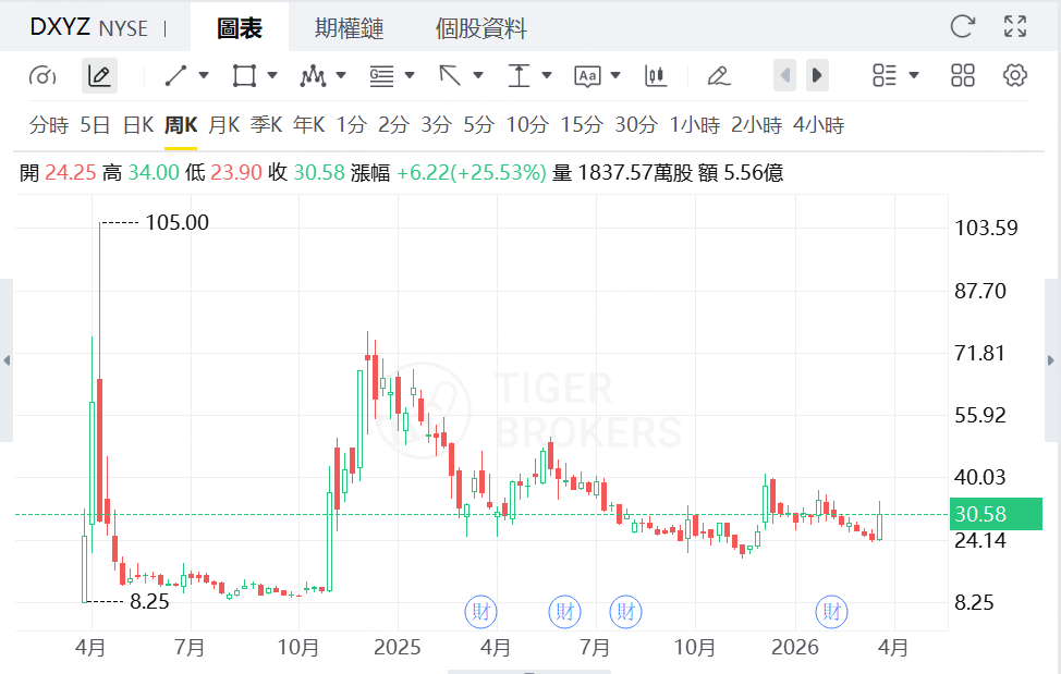 VCX近期的强势表现似乎也带动了DXYZ,后者周三上涨15%。目前,DXYZ股价为30.58美元,较其资产净值溢价约50%。