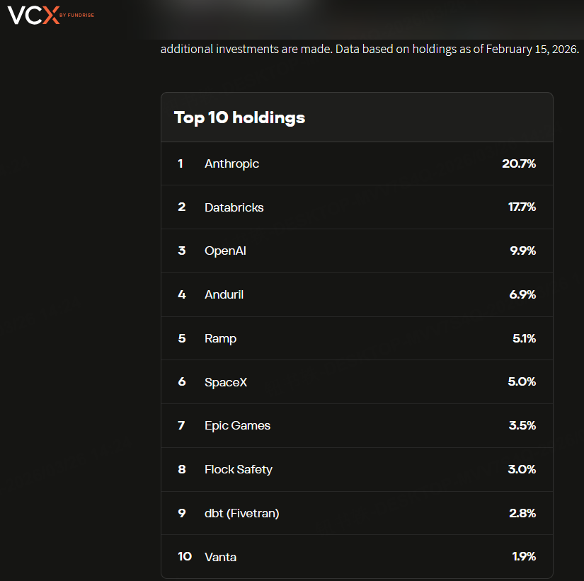 “VCX的时机更好,且持仓更为集中,Anthropic和OpenAI分别占其投资组合的20.7%和9.9%,这更符合当前散户投资者的偏好。”Talreja表示。但他同时指出,这并不意味着VCX当前的估值水平具有可持续性。