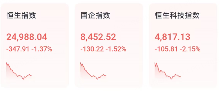 3月26日周四,港股三大指数上午低开低走,恒生指数跌1.37%再度失守25000点,国企指数、恒生科技指数分别下跌1.52%及2.15%。
