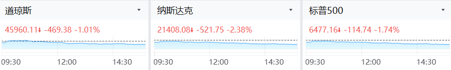 截至收盘,标普500指数跌1.74%,报6477.16点;纳斯达克综合指数跌2.38%,报21408.08点;道琼斯工业平均指数跌1.01%,报45960.11点。