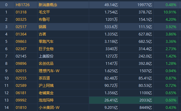 华盛资讯3月27日讯,新消费概念集体拉升,毛戈平绩后大涨超10%,古茗绩后涨超3%,巨子生物涨超2%,老铺黄金、泡泡玛特跟涨。
