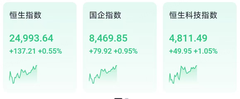 3月27日周五,港股上午盘三大指数低开高走,恒生指数涨0.55%有望重回25000点,国企指数、恒生科技指数分别上涨0.95%及1.05%,科指重上4800点。