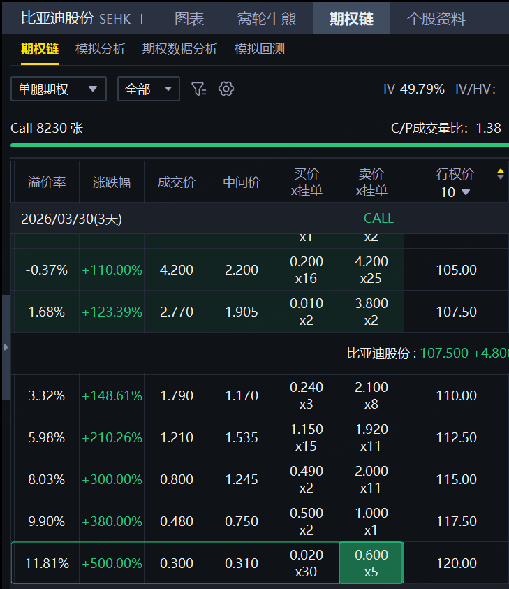 期权方面,比亚迪股份的认购合约价格随股价大涨。其中,一张3月30日到期的CALL,行权价120港元,价格暴涨500%。
