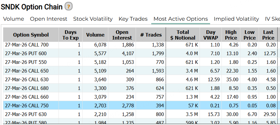 期权方面,闪迪的CALL成交依然活跃,一张今日到期的认购合约行权价达750美元。