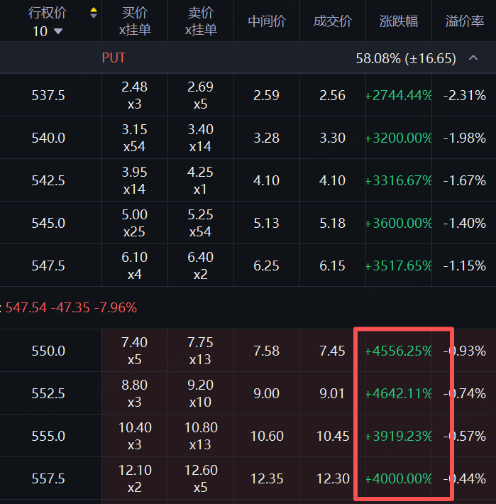 Meta的PUT周四全线飙升,多张今日到期合约价格涨幅超4000%。