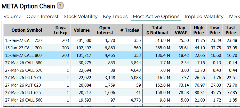 期权方面,昨日Meta排名前五位的都是认购合约。其中,一张明年一月到期的CALL,行权价高达800美元,较现价有近50%的涨幅空间。