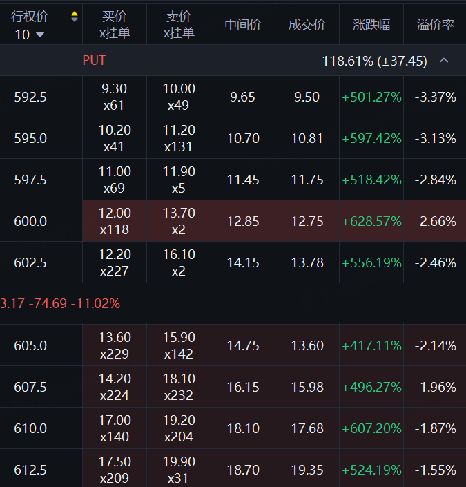 闪迪的PUT价格全线拉升,多张合约的涨幅在500%、600%之上。