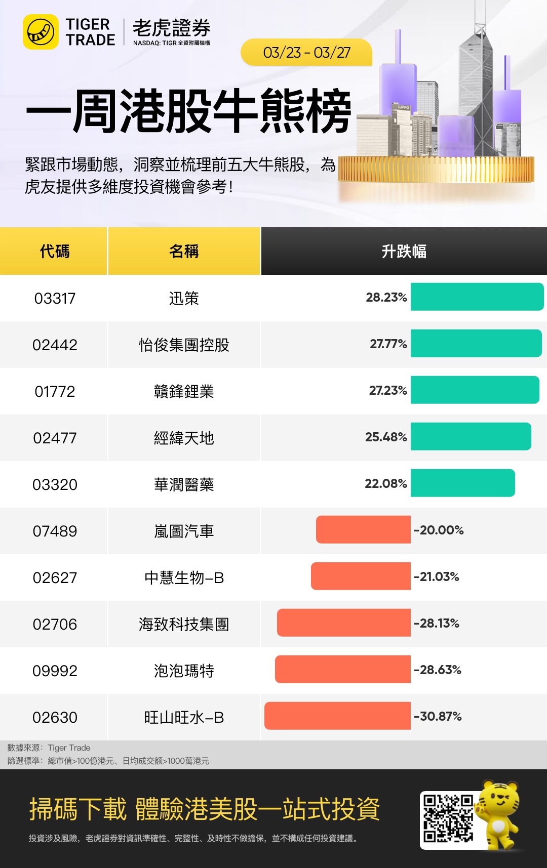 表现最好五只股票是: 迅策 、怡俊集团控股、赣锋锂业、经纬天地、华润医疗(市值百亿以上、日均成交千万以上);
