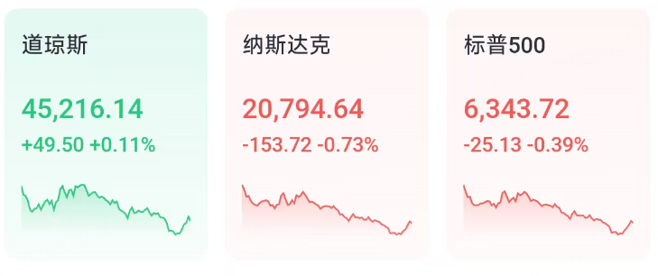 周一(3月30日),美股三大指数整体高开低走,收盘涨跌不一。截至收盘,道指涨49.50点,涨幅为0.11%,报45216.14点;纳指跌153.72点,跌幅为0.73%,报20794.64点;标普500指数跌25.12点,跌幅为0.39%,报6343.73点。