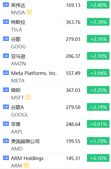 明星科技股普涨,Meta涨近4%,英伟达、特斯拉、谷歌、微软等均涨超2%。