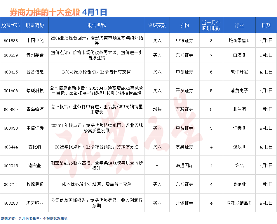 中国中免最受券商关注,近一个月获信达证券、东吴证券、爱建证券、太平洋、国金证券、信达证券等8份券商研报关注,仅4月1日就有国金证券和中银证券等两份券商研报,位居4月1日券商力推股榜首。