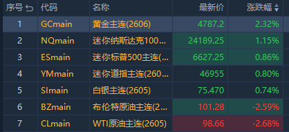 相关标的: $NQmain 、 $ESmain 、 $YMmain 、 $BZmain 、 $CLmain 、 $GCmain 、 $SImain