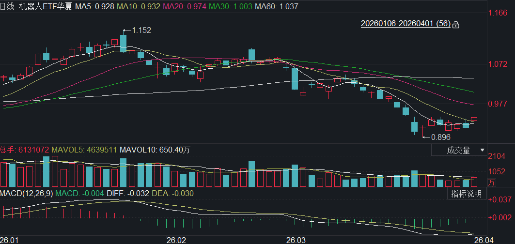 从3月下旬开始,跌势明显趋缓。K线在0.900附近形成了双底支撑,MACD指标底背离迹象初现。随着年报和一季报预告的陆续披露,一批真正有业绩支撑的机器人零部件企业开始止跌回升。目前的市场正处于一个“人心思涨”的临界点,科技板块的整体回暖为机器人赛道提供了良好的外部环境。