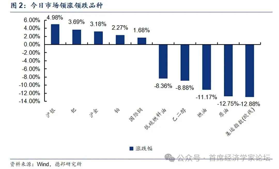 商品指数延续回落趋势,贵金属表现仍然强劲。今日南华商品指数收于3012.73点,下跌2.01%,黄金白银表现较好。领涨品种分别为沪银、钯、沪金、铂、国际铜,分别上涨4.98%、3.69%、3.18%、2.27%、1.68%;领跌品种分别为低硫燃料油、乙二醇、燃油、原油、集运指数(欧线),分别下跌-8.36%、-8.88%、-11.17%、-12.75%、-12.88%。