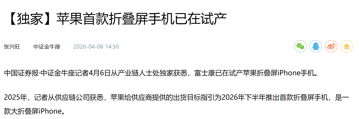 据内地媒体4月6日消息,富士康已在试产苹果折叠屏iPhone手机。
