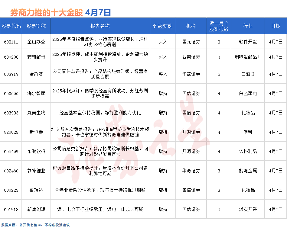 国内领先的办公软件和服务提供商——金山办公最受券商关注,近一个月获西南证券、中邮证券、信达证券、太平洋、东兴证券等8份券商研报关注,位居4月7日券商力推股榜首。