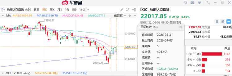 然而,就在过去的几天,市场在多重重压之下终于迎来了期待已久的“绝地反击”!纳指、标普连涨5个交易日,似乎暗示着这轮回调的终结;随着美伊两周停火协议的达成,此前因中东局势紧绷而流出的避险资金正加速回流。这种在极度悲观中爆发的强劲修复,究竟是短暂的空头回补,还是二季度多头正式吹响的反攻号角?