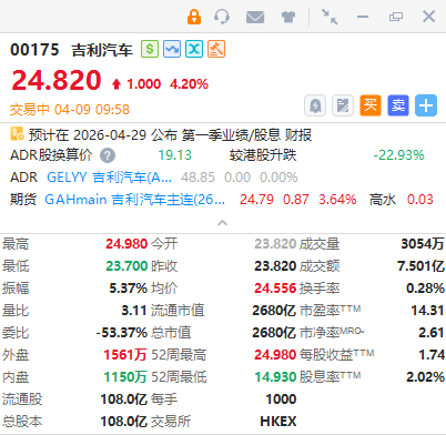 华盛资讯4月9日讯,吉利汽车再涨超4%,3月初至今累涨逾五成。截至发稿,涨4.2%,报24.82港元,成交额7.501亿港元。