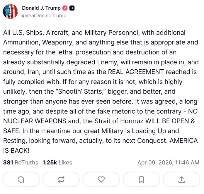 4月9日,美国总统特朗普在社交媒体上发文称,所有美国舰船、飞机及军事人员,连同额外弹药、武器以及任何其他适当且必要的物资,“将继续驻扎在伊朗境内及其周边地区,直到达成的协议得到全面遵守”。 (新华社)