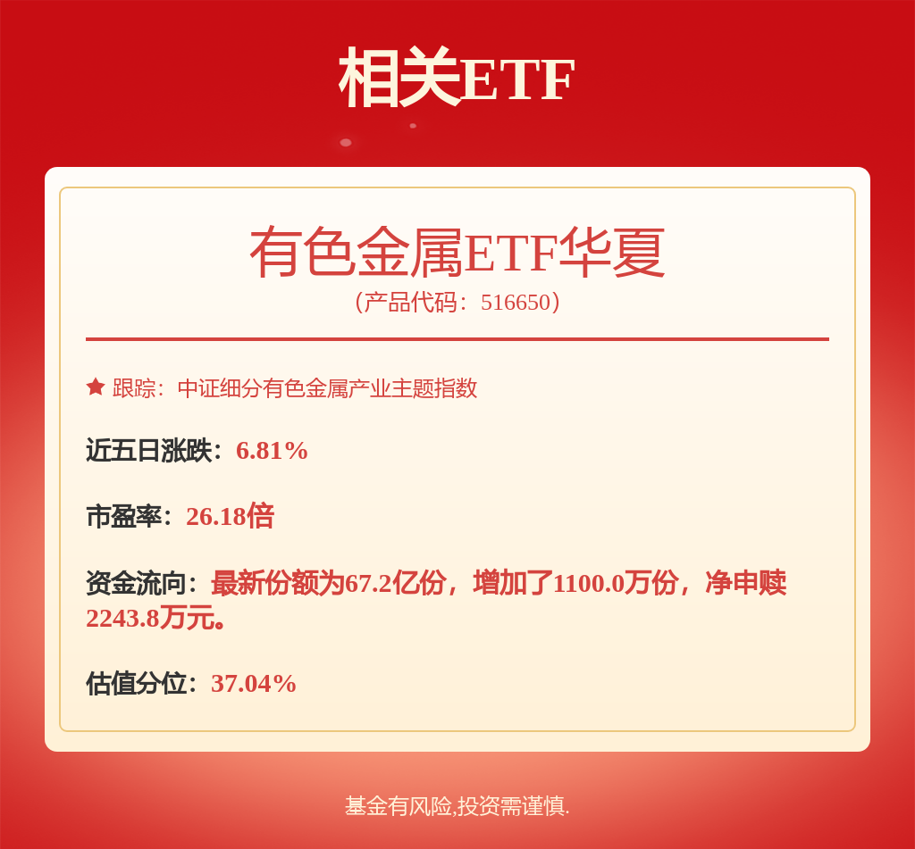有色金属ETF华夏(516650)跟踪中证细分有色金属产业主题指数,聚焦黄金及铜铝等工业金属、稀土与钨钼等小金属,指数金铜铝含量59.67%,赛道含量最高!经过近期调整,指数市盈率26.22倍,位于近10年42.97%分位水平,配置价值突显,随一季报陆续披露,有色金属板块有望迎季报行情。