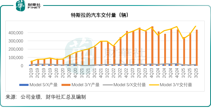 2025年第3季,Model 3/Y交付量按年增長9.36%,至48.12萬輛,高於同期產量43.58萬輛,特斯拉汽車總體交付量同比增長7.39%,至49.71萬輛,創出新高,見下圖。