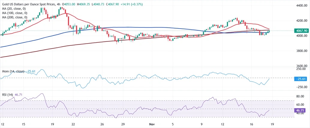 Bednarik指出,從技術角度來看,4小時圖顯示金價週二上漲。20週期簡單移動平均線(SMA)轉爲走低,在4090美元/盎司附近構成動態阻力。與此同時,200週期SMA繼續溫和上漲,目前位於4074.85美元/盎司,並守在100週期SMA(4041.52美元/盎司)上方,後者構成重要的動態支撐。此外,動量指標仍低於中線,但略有上升,表明空頭壓力正在減弱。最後,相對強弱指數(RSI)處於中性水平,爲46。