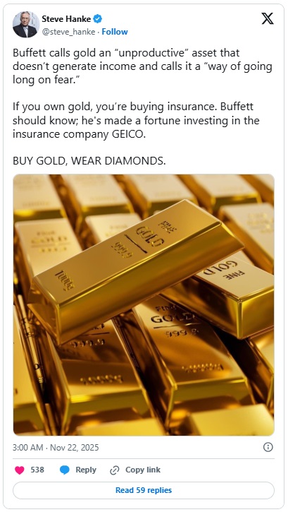 然而,在11月22日發佈於X的一則帖子中,漢克對這一立場提出質疑,強調黃金的首要目的並不是像生產性資產那樣運作,而是充當「保險」。