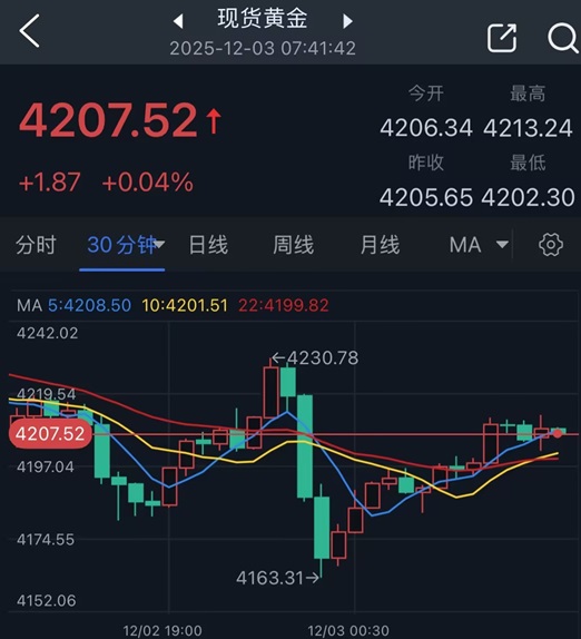 截至週二收盤,現貨黃金收報4205.65美元/盎司,跌幅0.6%,日內高點4235.87美元/盎司,低點爲4163.31美元/盎司。