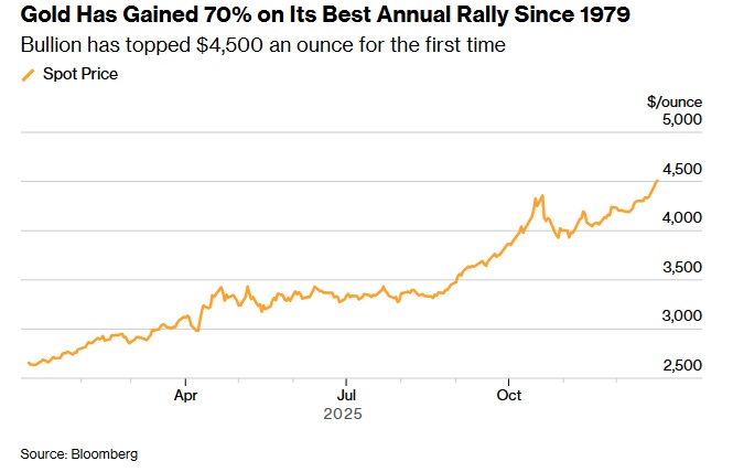 2025年迄今,黃金價格漲幅接近70%。黃金和白銀均有望創下自1979年以來最佳年度表現。貴金屬價格上漲主要得益於各國央行加大購金力度以及資金流入交易所交易基金(ETF)。