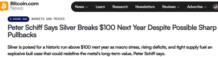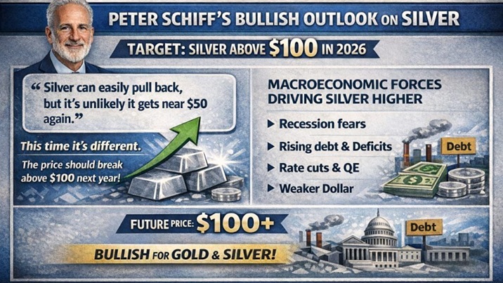 24K99訊 華爾街大鱷、經濟學家彼得·希夫(Peter Schiff)表示,銀價將在明年突破100美元,因宏觀經濟壓力、不斷上升的赤字和供應緊張等因素推動了一個可能重塑該金屬長期價值的爆炸性牛市。