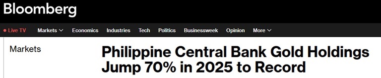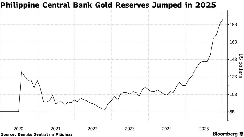 根據菲律賓央行週三深夜發佈的數據,截至2025年末,其黃金持有量升至186億美元的歷史最高水平,約佔外匯儲備的17%——此前官員曾表示,這一比例高於理想水平。