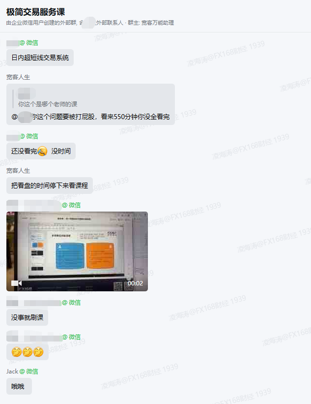 熱鬧的盈利分享中,一位同學拋出的問題,卻讓寬客老師敏銳地察覺到了關鍵:這個問題的根源,在於該同學並沒有完整聽完配套的理論課程。沒有絲毫含糊,寬客老師當即對這位同學進行了嚴肅叮囑:「交易不是靠運氣押注,《極簡交易方法論》的每一節理論課,都是從實戰中提煉的底層邏輯。跳過理論直接上手,就像沒打地基就蓋樓,看似快,實則風險重重。」這番話,讓羣裏的老學員紛紛點頭認同。緊接着,大家主動曬出了自己的學習日常。 這些認真溫習視頻課的痕跡,不僅贏得了羣內同學的一致讚許,更印證了一個樸素的道理:交易盈利的背後,從來都是 「方法吃透 + 刻意練習」 的雙重加持。