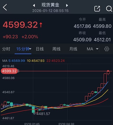 現貨黃金目前最高觸及4599.80美元/盎司,日內暴漲90美元,創下歷史新高。