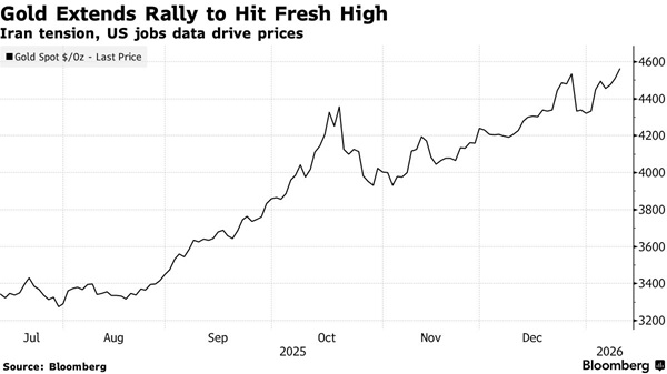 盛寶銀行大宗商品策略主管Ole Hansen在一封電子郵件中表示,與伊朗和委內瑞拉相關的地緣政治風險升溫,重振了對黃金的避險需求。